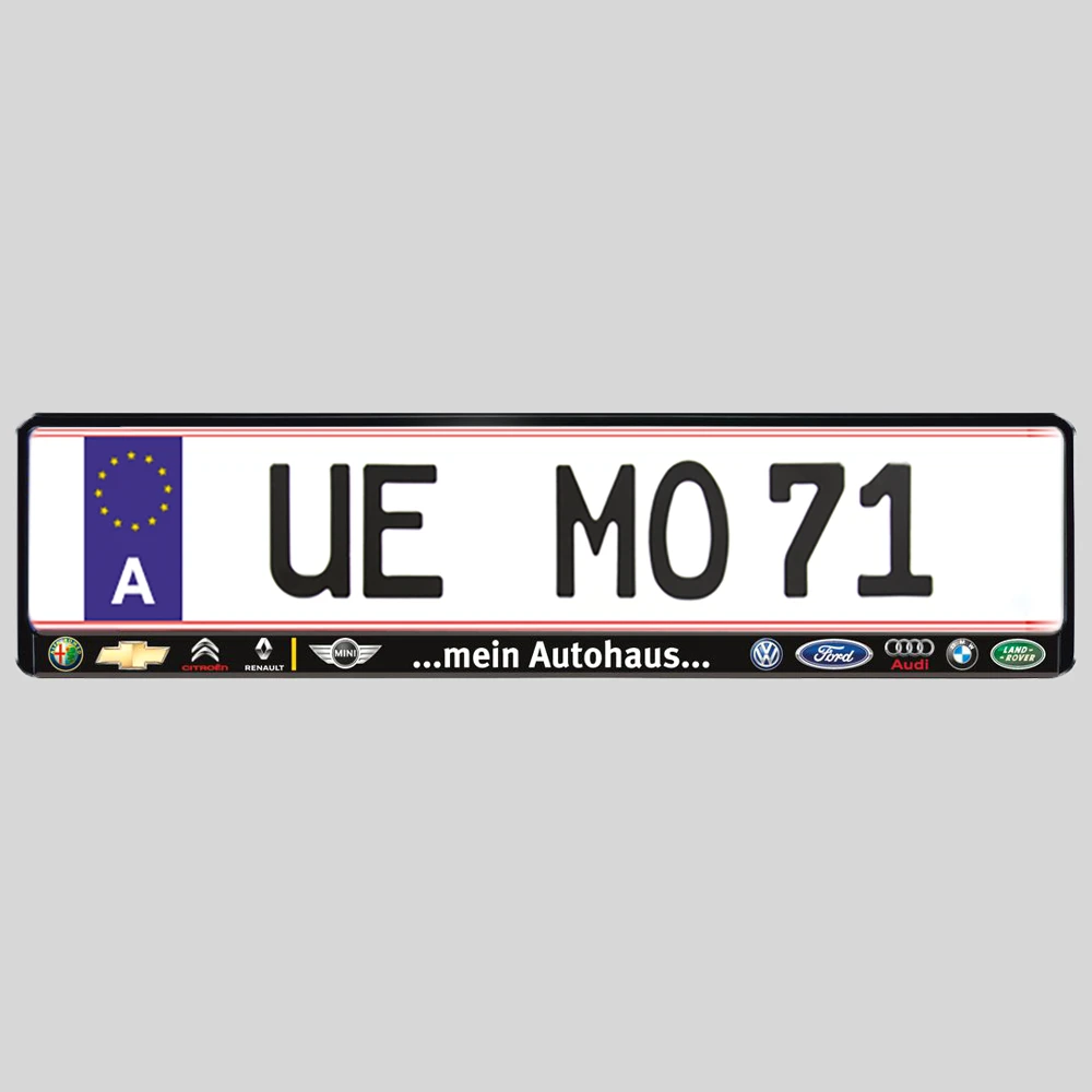 Einer unserer Topseller: Der klassische Auto-Kennzeichenhalter mit schwarzer Grundplatte und Leiste made in Germany inkl. einem individuellem einfarbigem Werbeaufdruck passend für alle gängigen österreichischen Autos. Auf der 503 x 18 mm großen Druckfläche auf der schwarzen Kennzeichenhalterleiste findet Ihr Wunschaufdruck Platz. Beliebte Aufdrucke sind unter anderem das Firmenlogo, der Firmenname, die Telefonnummer oder die Webadresse. Zur Erleichterung finden Sie einige Vorlagen in unserem Online-Gestaltungs-Tool. Individuell bedruckte KFZ-Nummernschildhalter bieten den Vorteil, dass Ihre Werbung mit Ihnen zusammen durch die Gegend fährt. Dadurch werden viele potenzielle Kunden auf Ihr Unternehmen aufmerksam. Ergreifen Sie die Chance und lassen Sie bei uns PKW-Kennzeichenhalter bedrucken.