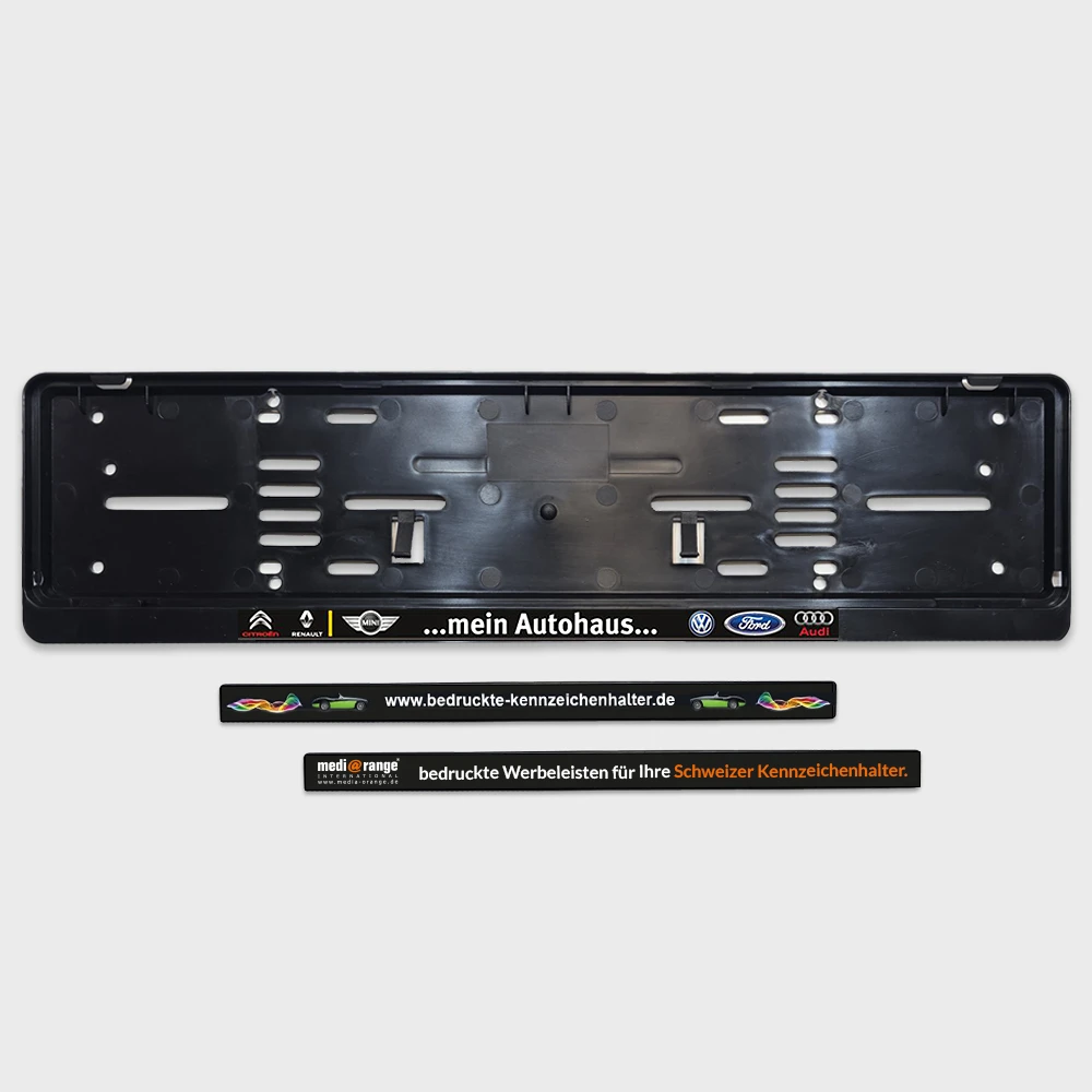 Beide Halter sind mit einem mehrfarbigen Aufdruck versehen – identisch auf beiden Werbeleisten und im Gesamtpreis bereits inkludiert. Ideal für Autohäuser, Werkstätten oder Firmenflotten mit hohem Anspruch an Markenwirkung und Wiedererkennung.