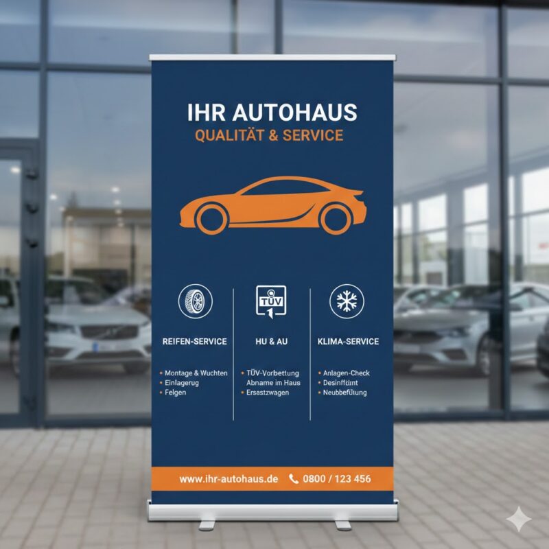 Präsentieren Sie Ihre neuesten Fahrzeugmodelle oder Service-Angebote unübersehbar. Wir lassen für Sie hochwertige Rollup Banner drucken, die durch ihre Mobilität und einen sekundenschnellen Aufbau bestechen – ideal für Verkaufsräume oder lokale Messen. Für den Außenbereich oder großflächige Fassadenwerbung können Sie bei uns zudem robuste PVC Banner drucken lassen. Diese sind wetterfest, reißfest und sorgen dank brillantem Druck für maximale Aufmerksamkeit an Ihrem Standort.